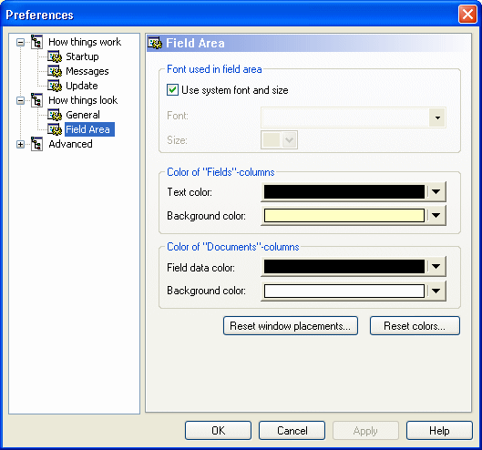The Reset windows placements button will revert all window positions in List Fields back to original state. This feature is included to make you able to come back to the original state, if you have lost track of where all the windows are. In addition, List Fields sometimes experience small problems with window positions. A press on this button remedy that problem. All layout files will also be removed.