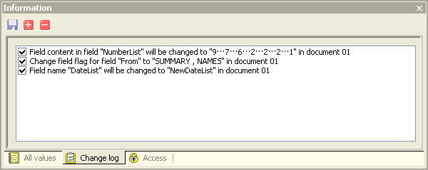 As soon as you change anything in List Fields the change log entries will be listed here. A change log entry can either be active or non-active, meaning that they will be processed or not. Use the Select all or De-select all buttons on the toolbar to select- or de-select all entries in one operation. Below you see the Change Log with some change log entries registered;