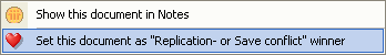 - Set this document as "Replication- or Save conflict" winner. By selecting this menu item, you will force this document to be the winner of the conflict. All other participating conflict-documents may be deleted. As for any other changes in List Fields, several change log entries will be created, and no actual conflict resolving will be processed until you explicitly confirm List Fields to do so.