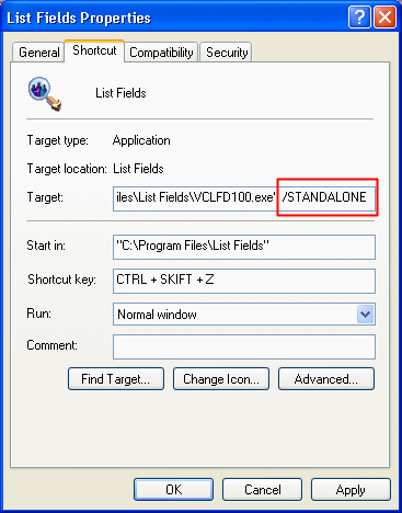In the figure above the /STANDALONE parameter has been added to the short-cut's Target. Whenever you launch List Fields from this short-cut, it will now try to detect which document you are working on automatically.