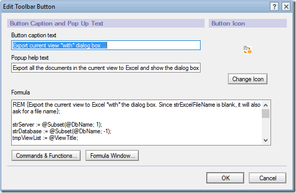 Note that we have some fields we can fill in. The first Button caption text is the text as we will see it it in the preferences dialog box etc. Since this is a buttonand not a text , we will first and foremost see only the icon in the toolbar. The Popup help text is the text that will be shown when you hover the mouse over the toolbar button later. The Formulais the actual @formula to run when the button is pressed. Finally you can change the icon.